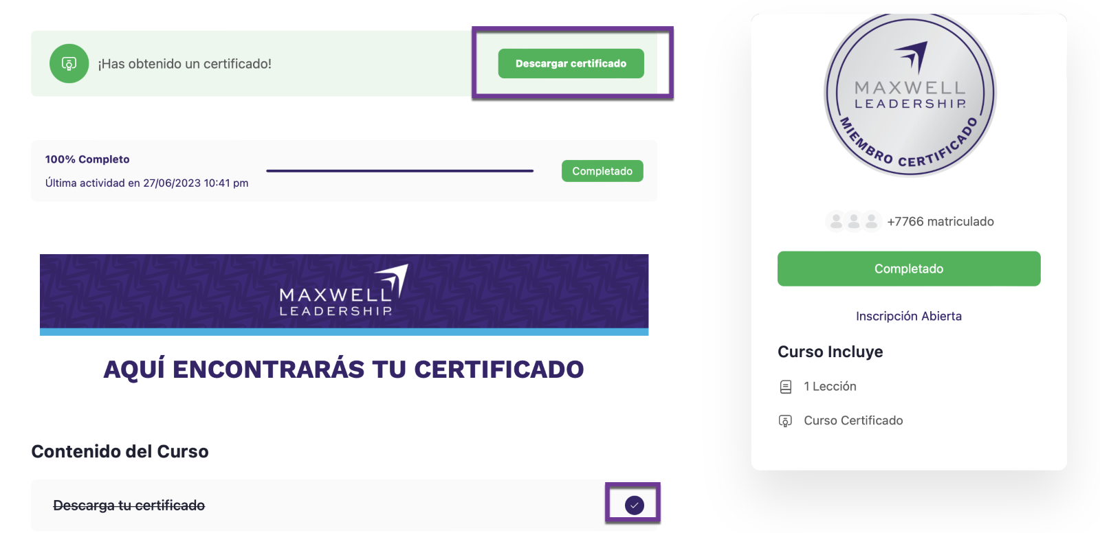 Debes marcarlo como completado, una vez hecho esto te aparecerá en automático el botón “descargar certificado” le das clic y te mostrará tu. certificado.