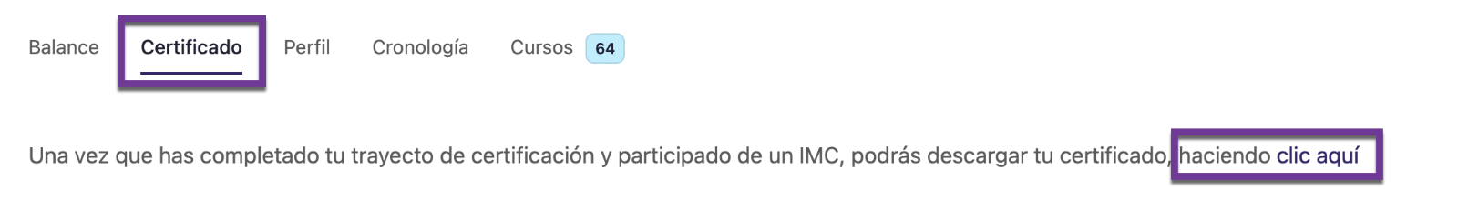 Te llevará a tu perfil, da clic a la opción “Certificado” (si no han completado alguno de los requisitos te aparece una leyenda de que no estás en el nivel correcto). Al terminar todos los requisitos para certificarte aparece la leyenda que ves en la captura, dé clic en “clic aquí” y se descarga en automático tu certificado.